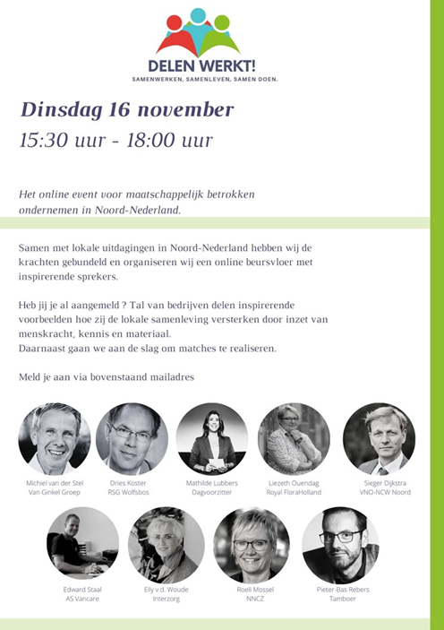 Dinsdag 16 november van 15:30 tot 18:00 organiseren lokale Uitdagingen in Noord-Nederland een groot online event voor maatschappelijke organisaties en initiatieven en maatschappelijk betrokken ondernemers en professionals in onze regio. Iedereen is van harte uitgenodigd om deel te nemen. Hieronder meer informatie over het programma en hoe aan te melden. Stuur dit bericht gerust door aan anderen voor wie dit interessant kan zijn.